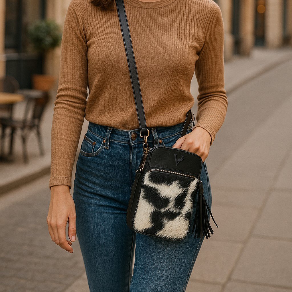 Each cowhide hair-on Mobile Cross Body Bag boasts unique natural patterns and textures, making every piece one-of-a-kind. The distinct variations in the cowhide ensure that no two bags are the same.