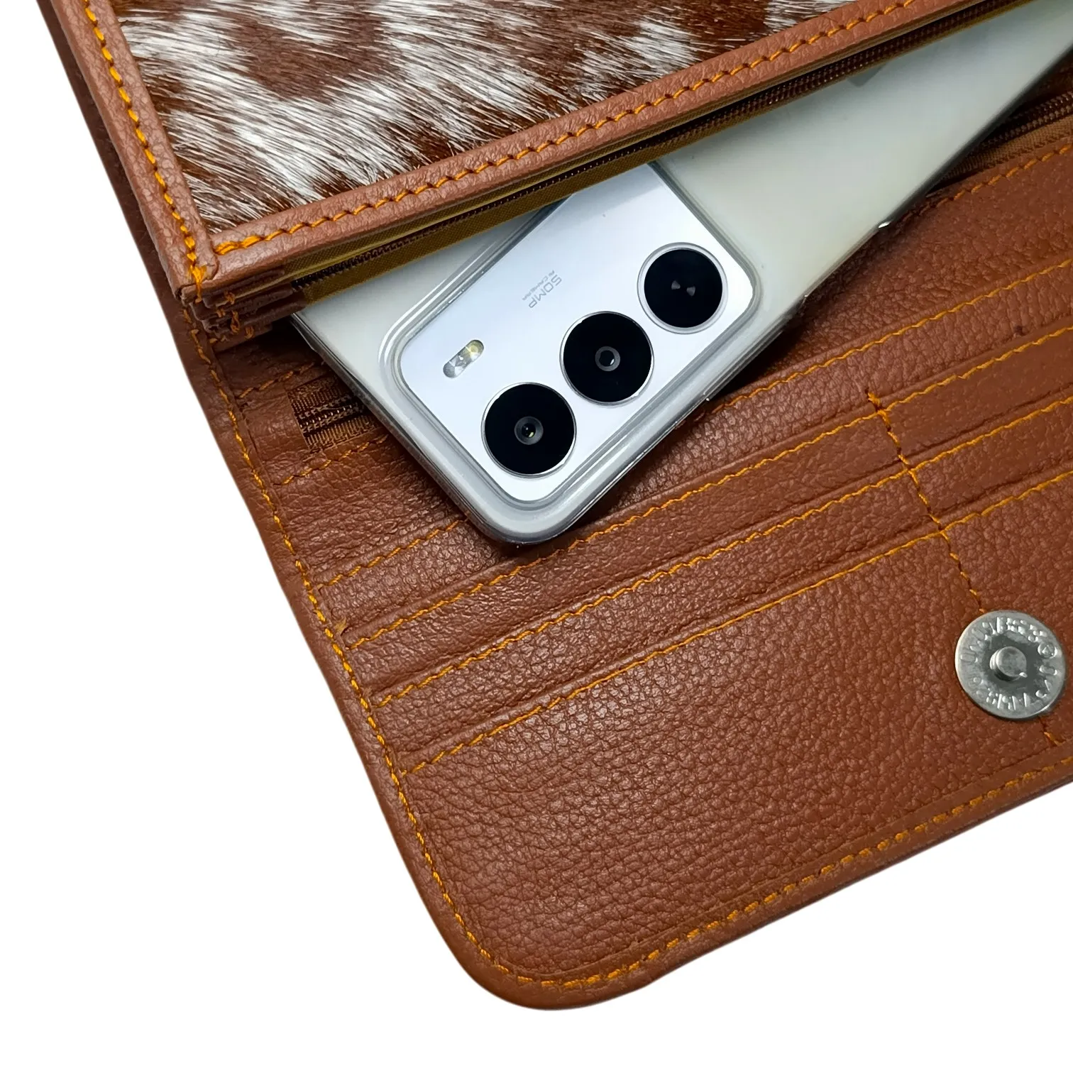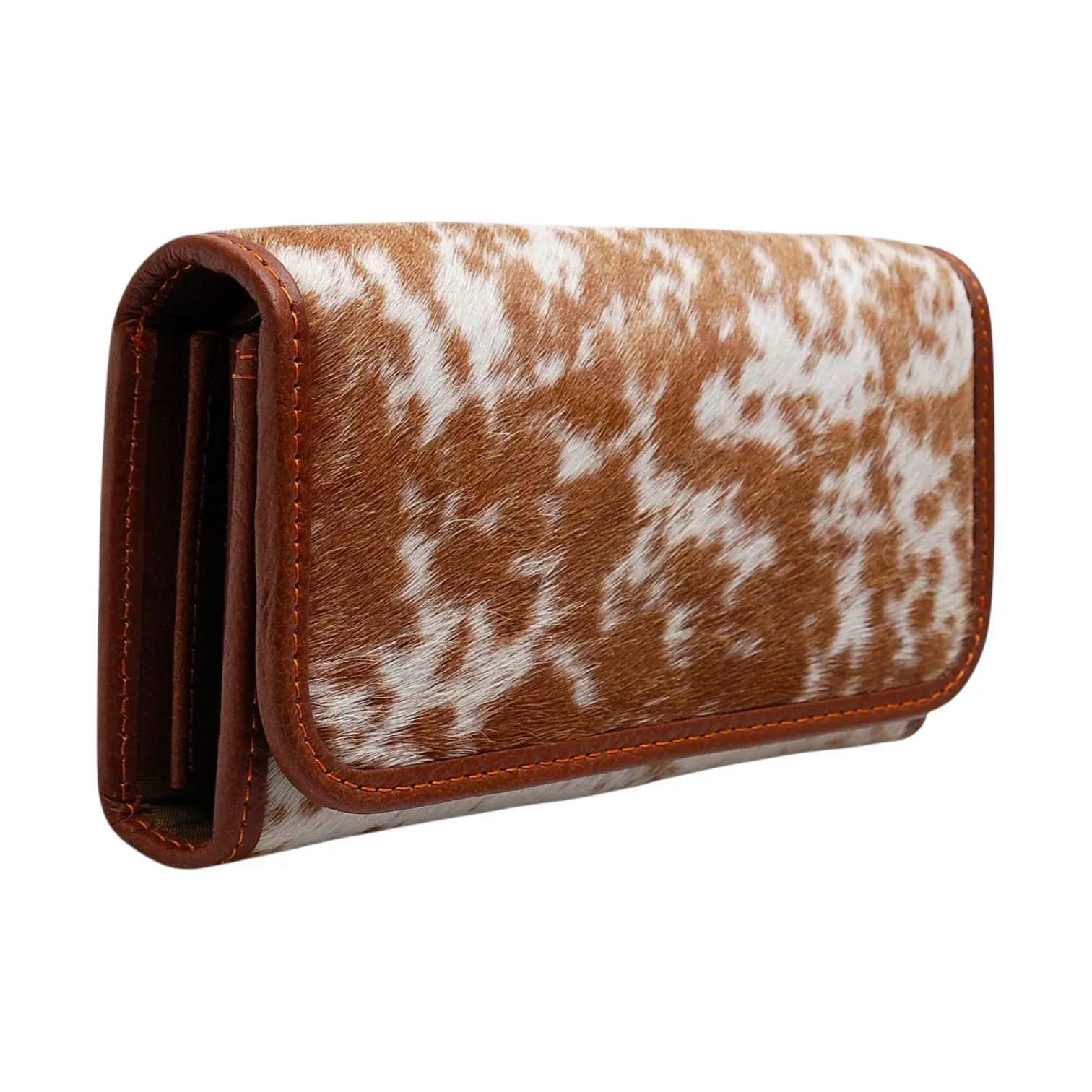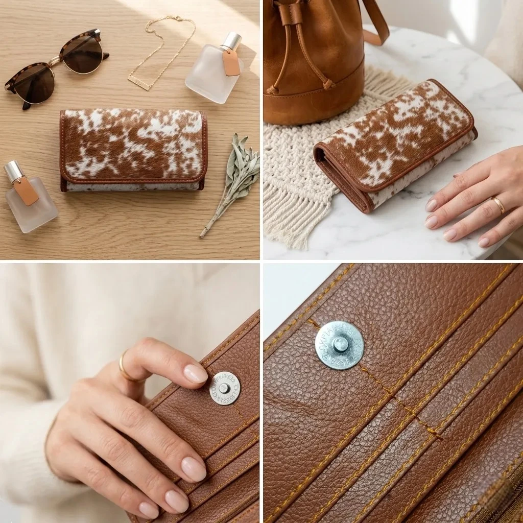 Experience authentic craftsmanship with this cowhide trifold wallet, made from 100% genuine leather and designed for everyday durability. Featuring a natural tan and white cowhide pattern, each wallet is truly one of a kind — no two pieces are ever identical.