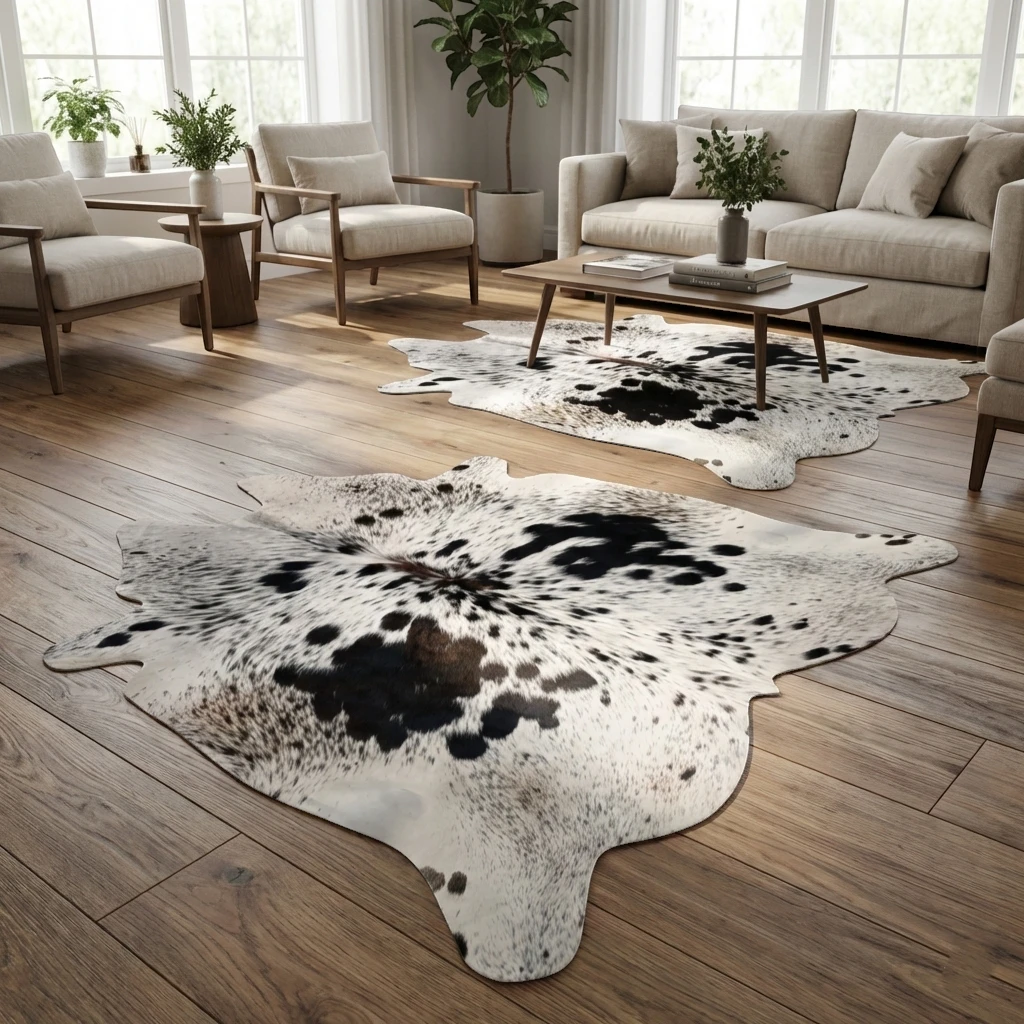 Cowhide Rug. Each piece is 100% genuine and unique, with natural patterns that can’t be duplicated. Perfect for living rooms, offices, or statement décor.