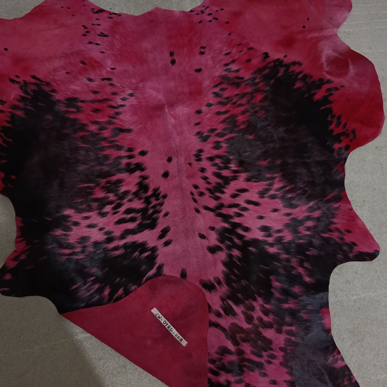 • genuine leather medium cowhide rug red dyed natural black markings overhead