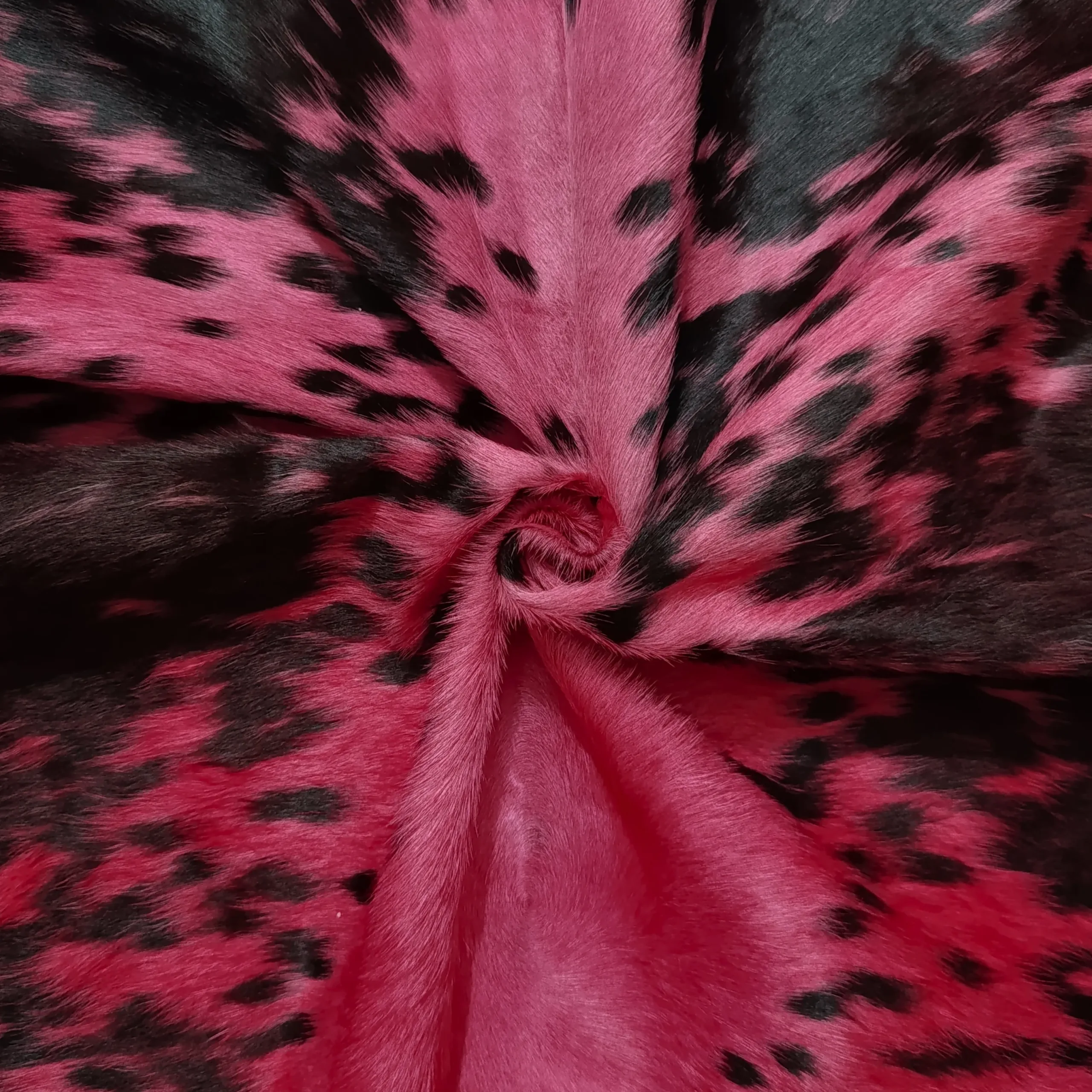 • hand dyed crimson cowhide rug medium format hair on leather close-up