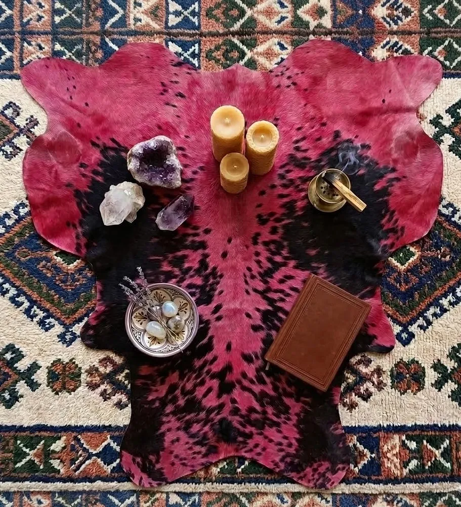 Medium-size cowhide rugs occupy a difficult design space. Too small and they look like afterthoughts; too large and they crowd the room. This medium red dyed cowhide rug is proportioned to exist in neither category — at 4’4″ x 4’6″ it fits naturally in the spaces most homeowners are actually decorating: a study, a bedroom, a dining area in a city apartment.